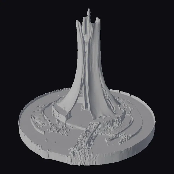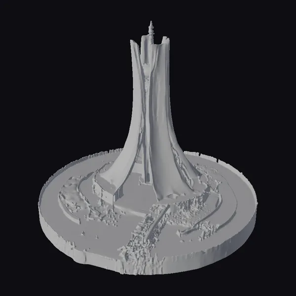 In a majestic pose, the Algiers Monument Structure stands tall, its four beige, curved pillars converging at the base and flaring outwards, supporting a slender spire. The model’s base is encircled by a road, with a small plaza and walkway leading to the monument’s entrance. The textures and lighting accentuate the concrete and stone materials, imbuing the scene with an urban, modern atmosphere. Ideal for use in architectural visualizations, cityscapes, or as a detailed prop for games, print, VR/AR, and animation projects.