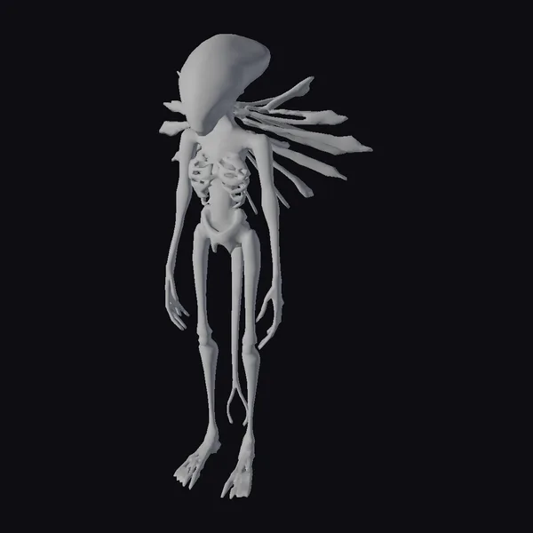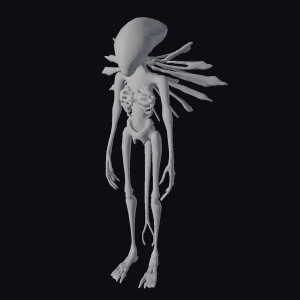Standing tall with an air of superiority, this extraterrestrial being showcases a smooth, alien skull devoid of a mouth, complemented by long, elegant arms and thin, spindly legs. The skeletal structure is accentuated by glowing blue veins and tendrils that traverse its body, adding a mesmerizing effect. Its back features a series of jagged, protruding spines, enhancing its menacing appearance. This 3D model is perfect for use in sci-fi projects, horror scenes, or any application requiring a futuristic, extraterrestrial entity. Its detailed anatomy and eerie glow make it an excellent choice for 3D printing, animation, or virtual reality experiences.