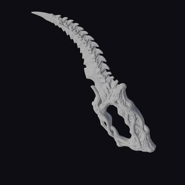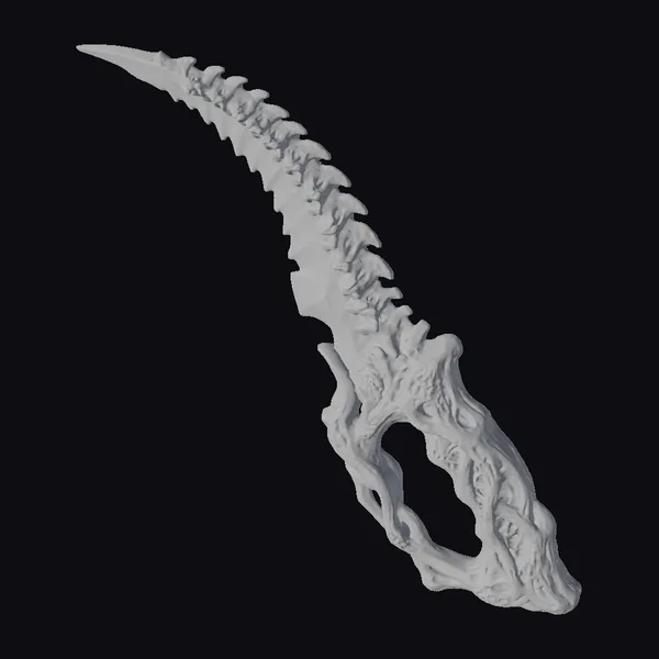 This striking alien ceremonial dagger features a blade that mimics the appearance of a spine, complete with detailed vertebrae that taper to a sharp point. The hilt is a complex arrangement of organic, bone-like formations, creating a handle that is both functional and visually arresting. The use of dark, chitinous material gives the dagger a foreboding presence, suggesting it could be used in dark rituals or as a symbol of power in a sci-fi or fantasy setting. The level of detail in this model makes it suitable for close-up shots in animations, games, or virtual reality experiences. Designers and artists can use this model to add a unique, extraterrestrial element to their work, whether it’s for a game environment, a 3D printed prop, or a detailed animation sequence.