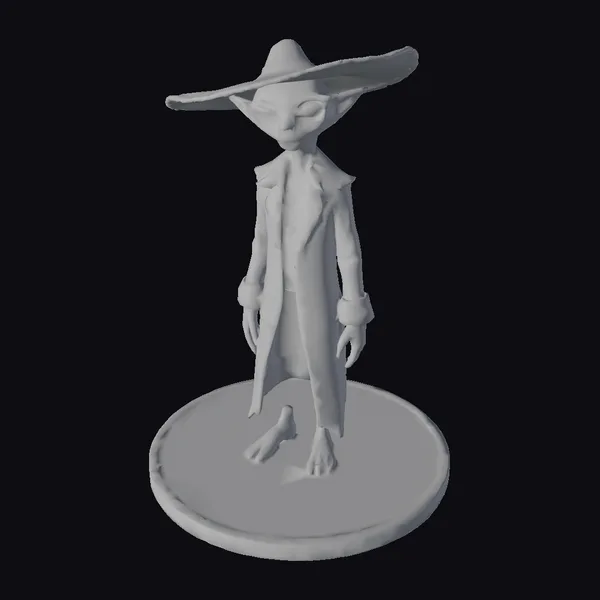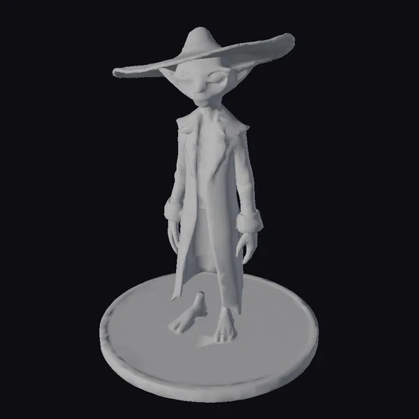 This striking alien figure is meticulously posed on a black circular stand, its smooth grey skin glistening under subtle lighting. The alien’s elongated head features large, almond-shaped eyes and ears, complemented by a skeletal chest visible through its open shirt. A wide-brimmed tan hat tops its head, while a long, dark coat with ornate designs drapes over its body. The model’s stylized appearance lends itself to various applications, including games, 3D printing, virtual reality, animation, and design projects. Its unique blend of sci-fi and cartel-inspired attire makes it a captivating addition to any creative endeavor.