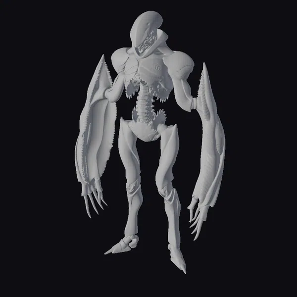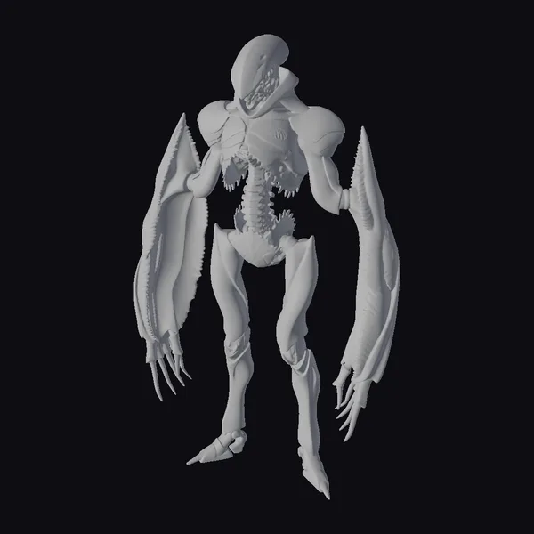 Standing tall with an imposing stance, the alien exomorph’s body is a marvel of intricate design. Its skeletal structure is visible beneath a mesh of metallic plates, with a distinctive dome-shaped headpiece and glowing red eyes. Two massive, claw-like appendages hang at its sides, each tipped with sharp, hook-like protrusions. The exomorph’s body is a blend of organic and synthetic elements, with a predominantly gray and silver color scheme that shifts to dark, rich tones in the shadows. This 3D model is perfect for use in sci-fi games, animations, or virtual reality experiences, offering a chilling presence that commands attention. Its detailed texture and realistic proportions make it an excellent choice for designers and artists seeking to create immersive, otherworldly environments.
