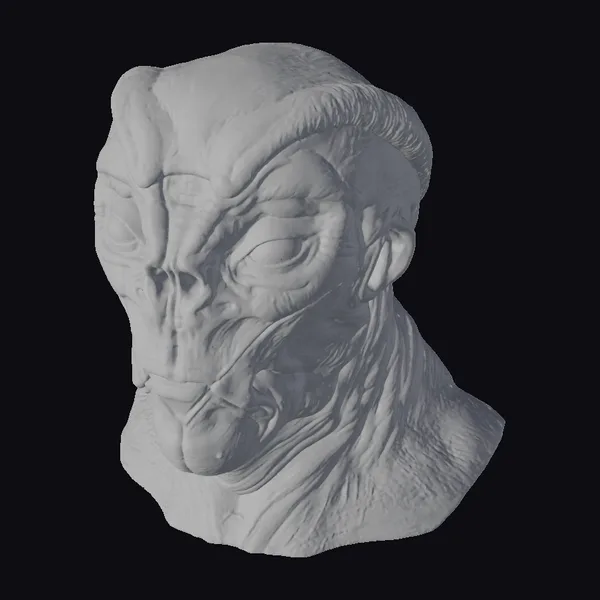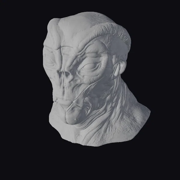 This intricately detailed alien head model showcases a mesmerizing blend of colors and textures. The creature’s green skin is adorned with orange spots, adding a pop of contrast to its already striking appearance. The large, black eyes seem to pierce through the darkness, while the wrinkled skin and bulbous forehead contribute to an aura of mystique. Perfect for use in sci-fi games, animations, or VR/AR experiences, this model is sure to captivate audiences. Its unique design and high level of detail make it an excellent choice for designers and artists looking to add an extraterrestrial element to their projects.