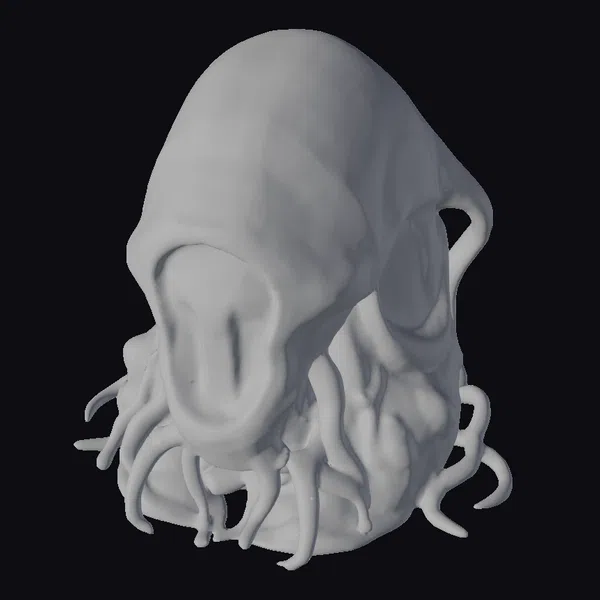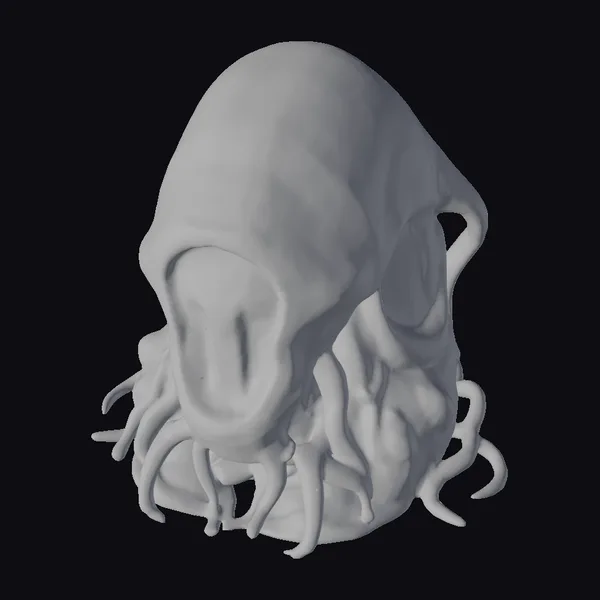 Perched atop a tangle of purple tentacles and teal bioluminescent growths, this alien creature’s head is a masterclass in otherworldly horror. The bulbous skull, a sickly off-white hue, is pulled back into a scream, revealing a cavernous mouth with jagged red interior structures. The model’s textures shift from smooth, almost translucent skin to the intricate, bumpy details of the creature’s eerie visage. The glowing teal spots add an air of malevolent life to the piece. Ideal for use in horror-themed games, animations, or as a striking design element, this model is sure to unsettle and captivate.