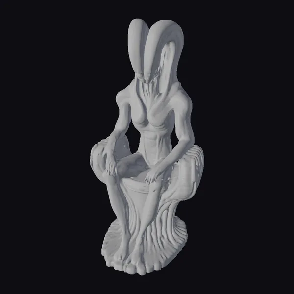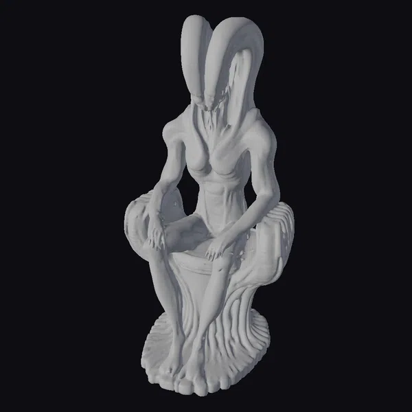 This striking alien creature sits atop a twisted, organic-looking throne, its elongated head appendages curving upwards like a twisted crown. The skeletal torso and limbs are rendered in exquisite detail, with a metallic sheen that suggests a fusion of flesh and machine. The creature’s pose, with hands resting on its knees, conveys a sense of brooding introspection. This model would be perfect for adding a touch of sci-fi horror to games, animations, or VR/AR experiences. Its unique design and intricate details make it an asset for designers and artists seeking to push the boundaries of fantasy and science fiction.