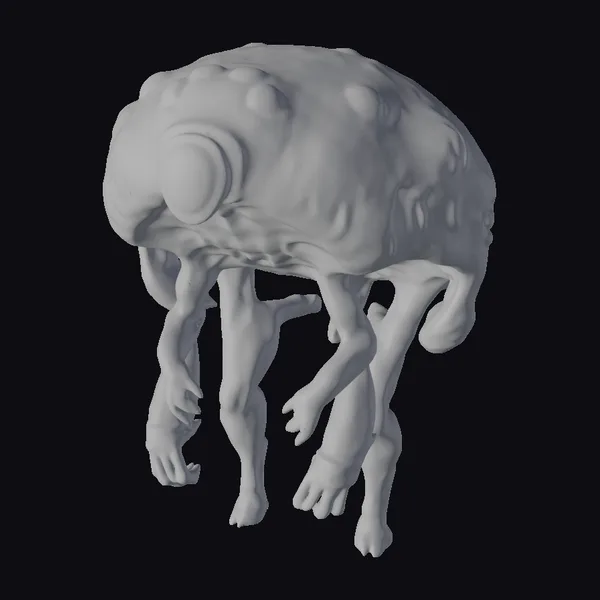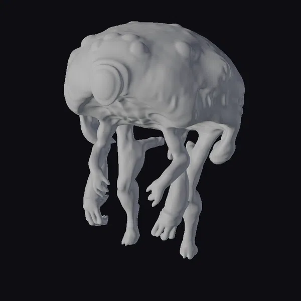 Perched on spindly legs, this alien creature appears poised to pounce, its twisted limbs splayed in a menacing stance. The bulbous body, adorned with bumpy protrusions, seems to glow with an otherworldly energy. A large, unblinking eye stares out from the front, exuding an aura of malevolence. The smooth, gray surface appears almost gelatinous, inviting the viewer to shudder at the thought of its texture. This 3D model would be perfect for adding a touch of sci-fi horror to games, animations, or 3D prints.