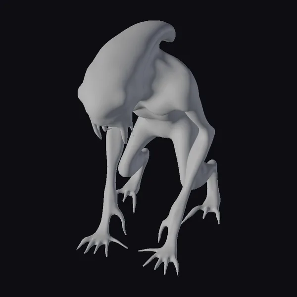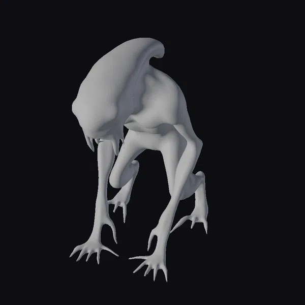 Detailed with precision, this alien creature stands poised in a crouched position, its body a blend of eerie green and dark undertones, suggesting a slimy texture. The creature’s elongated head features a pronounced, curved structure on top, complementing its long, pointed tail and sharp, claw-like fingers. Its eyes glow with an otherworldly light, adding to the menacing aura. The model’s intricate details make it perfect for use in sci-fi projects, horror animations, or video games requiring a terrifying alien presence. Its unique design ensures it will stand out in any 3D environment.