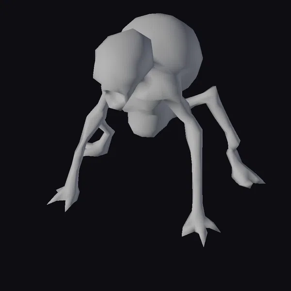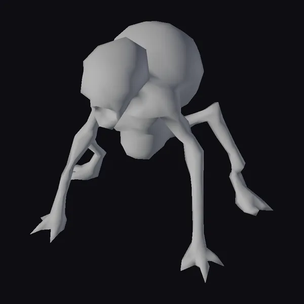 This unsettling alien creature is captured in a dynamic, crouched position, as if ready to pounce. The bulbous green abdomen is intricately detailed with texture, giving it a realistic, organic appearance. The creature’s head features a skeletal structure with glowing orange eyes that seem to pierce through the darkness. Its mouth is open, revealing sharp teeth, adding to the menacing demeanor. Long, spindly limbs end in sharp claws, suggesting a creature adapted for climbing or grasping. The overall appearance is that of a being from a nightmarish sci-fi universe. This model would be perfect for use in games, animation projects, or virtual reality experiences where a terrifying alien creature is needed.