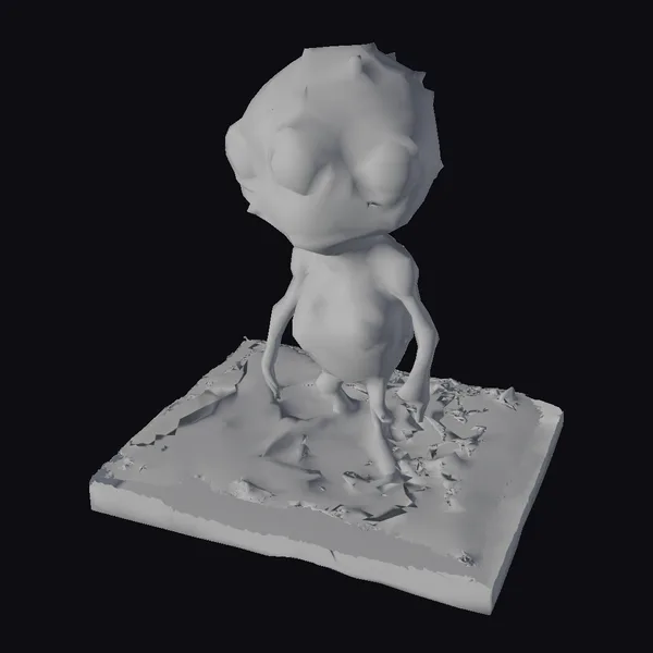 Perched on a weathered base, this stylized alien creature commands attention with its oversized, dark blue eyes that seem to hold a universe of secrets. The creature’s body is a mesmerizing blend of green and brown hues, punctuated by small, spiky protrusions that give it a uniquely alien appearance. Its pose, with arms slightly akimbo, suggests a readiness to spring into action or perhaps communicate with its surroundings. This model is perfect for projects that require a touch of sci-fi whimsy, from animated films and video games to virtual reality experiences and concept art. Its detailed texture and expressive features make it an excellent choice for designers and artists looking to add a dash of intergalactic intrigue to their work.