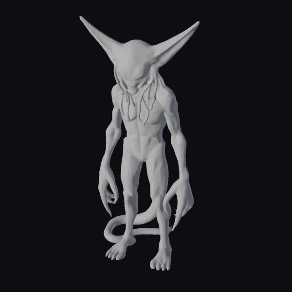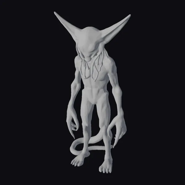 Standing tall with an air of intelligence, this alien creature exudes an aura of menace. Its body is a mesmerizing pale blue hue, with subtle texture and shading that suggests a scaly or smooth skin. Long, slender tentacles replace traditional limbs, each ending in sharp, gripping tips. The creature’s head is shaped like a teardrop, with two large, pointed ears that give it an unearthly appearance. Red, glowing eyes seem to pierce through the darkness, exuding an intelligent and malevolent presence. The creature’s physique is lean and muscular, suggesting incredible strength and agility. Its tail is long and slender, curling around its legs as it stands. This 3D model would be perfect for games, animation projects, or VR/AR experiences that require a unique, otherworldly character.