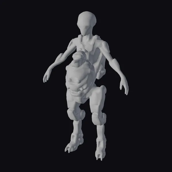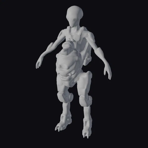 In a dynamic pose that suggests movement and agility, this alien cyborg stands with its arms outstretched and legs positioned for action. The model’s surface is a complex interplay of smooth, curved lines and sharp, angular details, showcasing a high level of craftsmanship. The alien co-pilot, safely secured in a specialized compartment on the cyborg’s chest, seems to be enjoying the ride, adding a lighthearted contrast to the otherwise serious tone of the piece. This 3D model would be perfect for projects that require a blend of science fiction and adventure, such as animations, games, or virtual reality experiences. Its detailed textures, realistic lighting, and balanced proportions make it an excellent choice for designers and artists looking to add a touch of the extraordinary to their work.