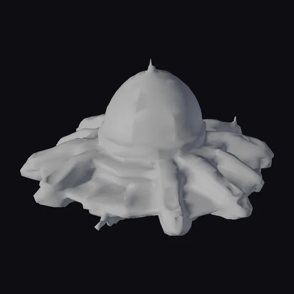 Perched atop a series of jagged, metallic protrusions, the dome-shaped cockpit of this alien defense ship shines with a mesmerizing gradient of green hues, transitioning smoothly from dark to light. The ship’s base is encircled by a series of angular, pointed extensions, giving it a menacing, defensive appearance. A series of bright green lights line the ship’s underside, casting an eerie glow on surrounding surfaces. As a 3D model, this spaceship is perfect for use in sci-fi games, animations, or virtual reality experiences, offering a unique blend of futuristic design and menacing functionality. Designers can utilize this model to create immersive environments, from space battles to alien encounters.