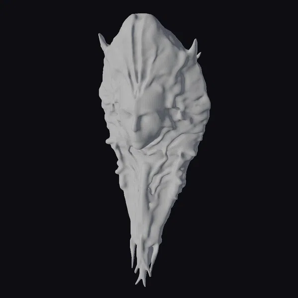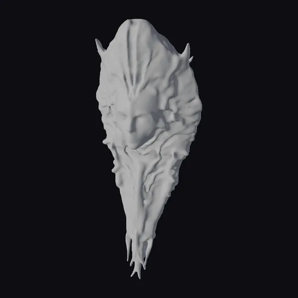 This intricately detailed alien mask showcases a striking contrast between its pale, human-like face and the dark, metallic, and organic structure that encases it. The face, with closed eyes, exudes a sense of calm, while the exterior is adorned with sharp, jagged protrusions and a complex network of lines and ridges. The mask’s design is a blend of futuristic and biomechanical elements, making it a captivating piece for any sci-fi or fantasy project. Its unique appearance makes it ideal for use in 3D modeling, animation, game development, or as a design reference.
