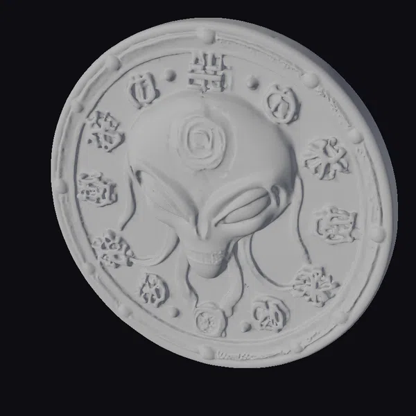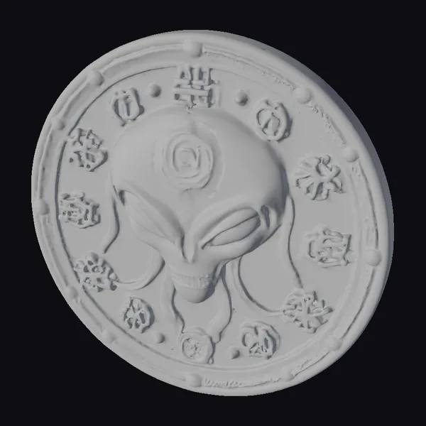 This exquisite copper plate showcases a highly detailed alien face relief, with a blue-skinned being gazing forward with piercing red eyes. The plate’s circular design features a raised, ornate border with gold accents and small red gems, adding to the overall sense of mystique and otherworldliness. The alien’s face is rendered in high detail, with subtle texture and shading that gives the impression of depth and dimensionality. The plate’s red-polished frame adds a pop of color and helps to draw the viewer’s eye to the central image. This 3D model would be perfect for use in sci-fi games, animations, or as a decorative piece in a futuristic setting.