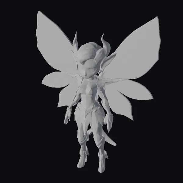 Detailed in every aspect, this stylized alien fairy stands poised with her weight shifted slightly forward, her large, translucent wings spread wide, capturing a dynamic moment frozen in time. Her facial features are finely tuned with a chibi-style simplicity, large eyes gleaming with a mysterious allure. The metallic armor covering her body is adorned with sharp, alien-like protrusions, suggesting a blend of organic and synthetic elements. The wings, a marvel of detailed design, reflect light with shades of blue and purple, adding to her enchanting presence. This model is perfect for projects requiring a unique blend of fantasy and sci-fi elements, suitable for animation, game development, VR/AR experiences, and artistic design.