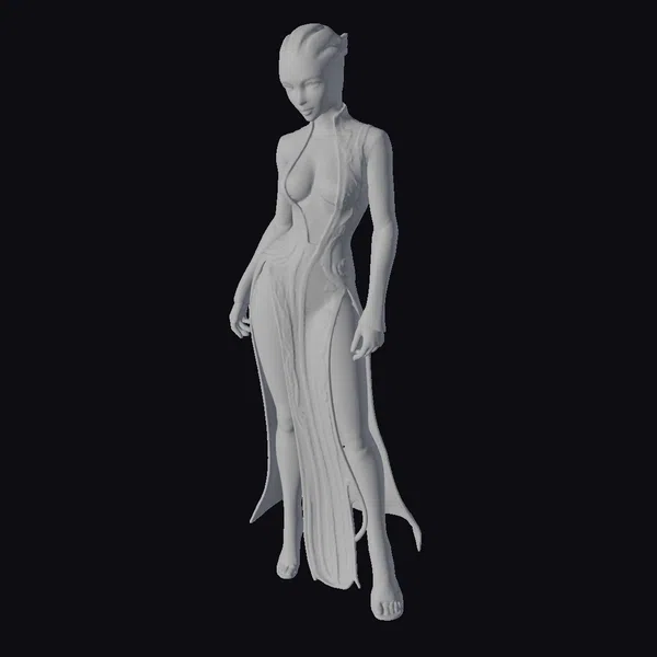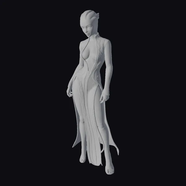 Standing tall with a poised demeanor, this alien female figure is meticulously detailed with a focus on her slender physique and elongated features. Her dress, a mesmerizing blend of blue and green hues, seems to glow from within, accentuating her form. The flowing cape-like design at the back of her dress adds a dynamic element to her appearance. Her facial features are delicately rendered, with a subtle expression that invites curiosity. This model’s intricate design and vibrant coloration make it an excellent choice for projects requiring a futuristic or sci-fi character, including games, animations, and virtual reality experiences.
