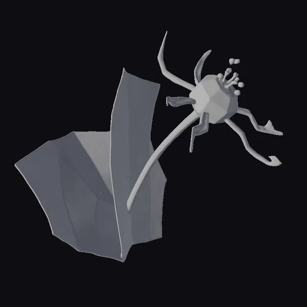 Deep in an imaginary world, a strange creature blooms from a fantastical flower. The creature’s bulbous gray head is adorned with green tentacles and a long, curved stamen that connects it to the flower’s base. The flower’s translucent petals are backlit with a soft yellow glow, casting an ethereal light on the surrounding environment. The model’s intricate details, from the texture of the petals to the delicate tentacles, make it a stunning addition to any fantasy or sci-fi project. Use it in games, animations, or 3D prints to add a touch of surrealism and wonder.