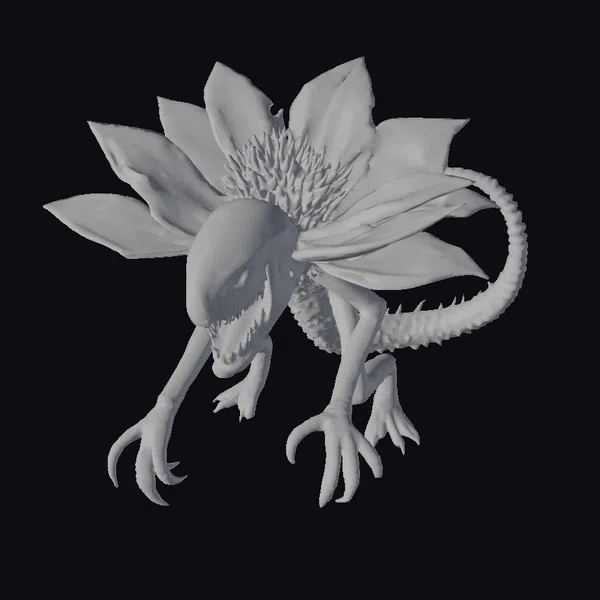This intricately detailed alien creature model showcases a mesmerizing blend of organic and metallic elements. The creature’s body is primarily a dark metallic color with a subtle sheen, while its back is adorned with a large, vibrant purple flower. The flower’s petals are delicately shaped and colored, with a warm orange center. The creature’s head features a distinctive elongated skull with a sharp, fang-like mouth and glowing red eyes. Its long, spiky tail and sharp claws add to its menacing appearance. The model is highly detailed, with intricate textures and lighting effects that bring the creature to life. Ideal for use in sci-fi games, animations, or 3D printing projects.