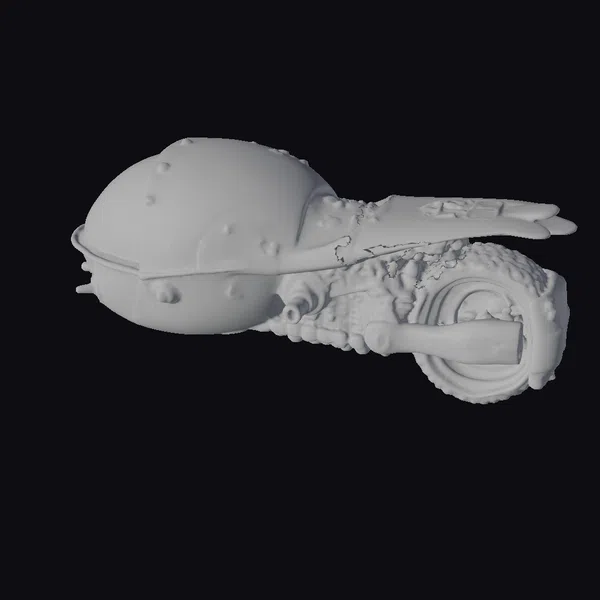 In a stunning display of extraterrestrial innovation, this flying scooter boasts an asymmetrical design forged from dark alloy plates. The vehicle’s organic curves and sharp lines are accentuated by red highlights that pulse with an otherworldly energy. A large, blue-and-gray dome dominates the scooter’s front, while a rugged, red-tinted wheel hints at its ability to traverse diverse terrains. As a 3D model, it offers immense creative potential for projects requiring a futuristic, sci-fi aesthetic, such as animations, games, or virtual reality experiences. Its unique design ensures it stands out in any scene, from futuristic cityscapes to intergalactic adventures.