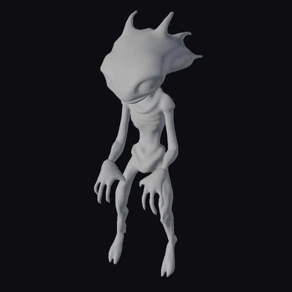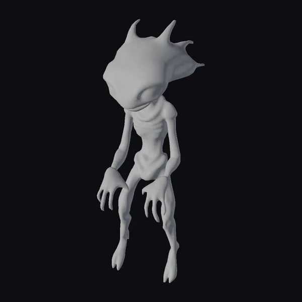 Perched in a menacing crouch, this stylized alien creature appears poised to spring into action. Its elongated head features a wild tangle of spiky, iridescent protrusions that shimmer with an ethereal glow. The body, a latticework of dark, chitinous plates and gleaming cybernetic limbs, seems to shift and ripple like living shadow. Glowing green accents pulse through its skeletal fingers and toes, casting an eerie light on the surrounding environment. As a 3D model, this entity is primed for use in games, animation, or VR/AR experiences, where its unique blend of gothic and sci-fi elements can add a touch of dark magic. Designers can also leverage its intricate details and menacing posture to craft compelling scenes or characters.