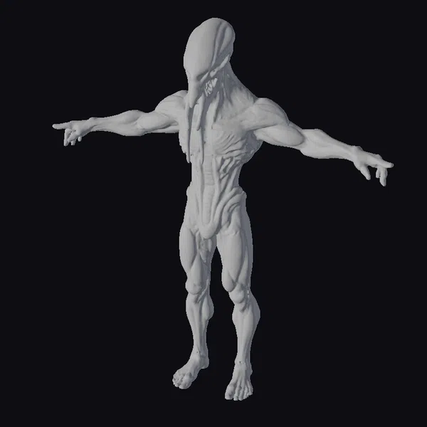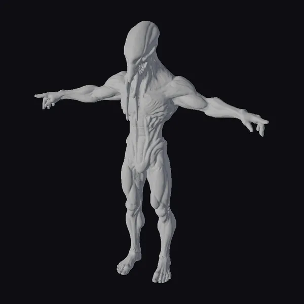 Detailed with precision, this extraterrestrial being boasts a uniquely shaped head, accentuated by a long, protruding facial feature. Its body, a blend of muscular definition and slender physique, showcases a range of motion with its outstretched arms. The pale, almost translucent skin hints at an alien biology. Textures and lighting interplay to create a realistic, high-definition appearance. Ideal for use in sci-fi projects, animations, or video games, this model brings an air of mystery and advanced technology to any scene.