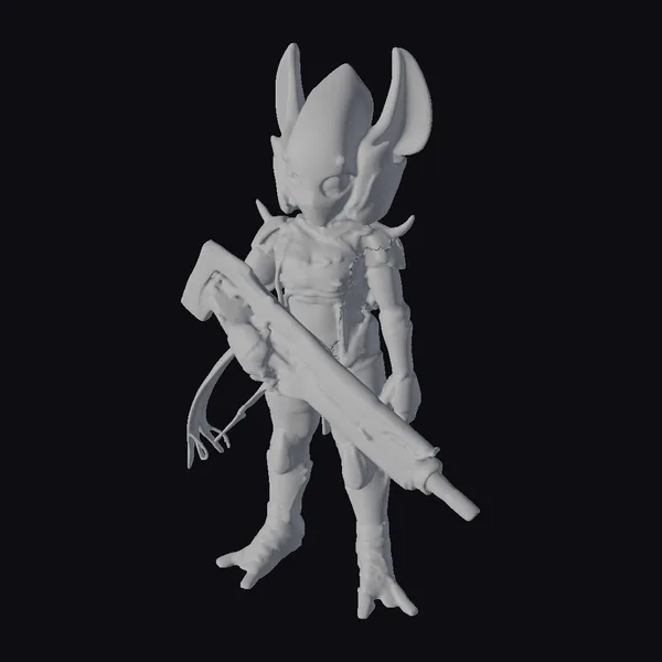 Standing tall with an air of readiness, this intricately detailed alien model showcases a blend of sci-fi and fantasy elements. Its green, almost pale complexion contrasts with the dark, metallic parts of its combat suit, accentuated by sharp, armor-like protrusions on the shoulders. The suit itself appears robust, designed for battle, with detailed textures suggesting advanced technology. The alien’s head, characterized by a sleek, pointed shape and oversized ears with hints of orange and red at the tips, adds to its otherworldly appearance. Its large, black eyes exude a sense of alertness, while the weapon it grips seems both futuristic and menacing. This model is perfect for projects requiring a blend of sci-fi and fantasy, such as animations, games, or virtual reality experiences.