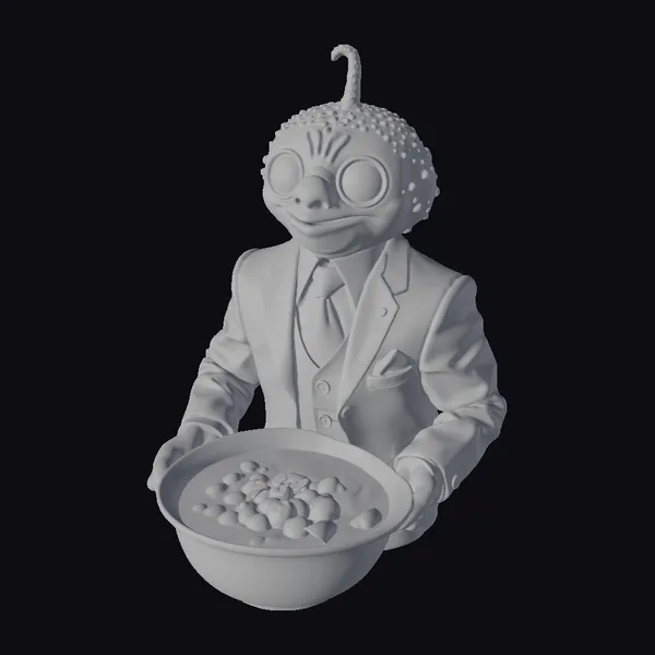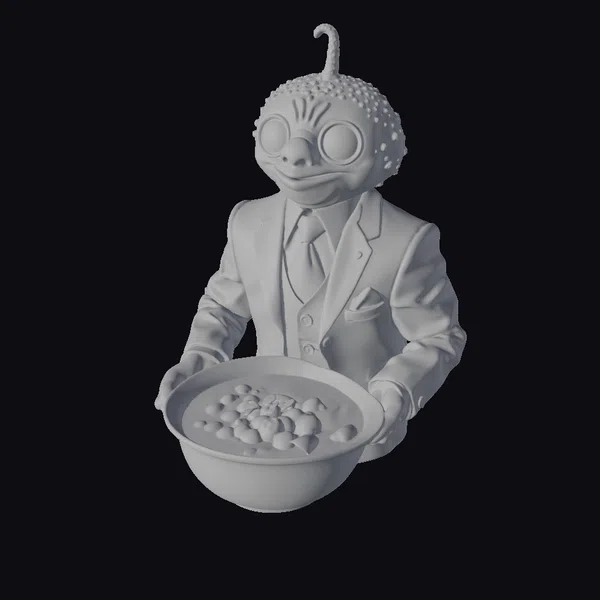 In a delightful fusion of intergalactic elegance and culinary charm, this stylized alien character stands poised, offering a vibrant bowl of soup that seems to leap from the screen. The alien’s head, with its textured, bumpy skin and bright, large eyes, is a masterpiece of stylized design, complemented by a well-tailored blue suit, crisp white shirt, and a pop of color from its red tie and pocket square. The bowl of soup, filled with a medley of colorful ingredients and topped with a sprinkle of green herbs, adds a cozy, inviting feel to the scene. This model is perfect for projects requiring a touch of fantasy and whimsy, whether for animation, game development, or conceptual design.