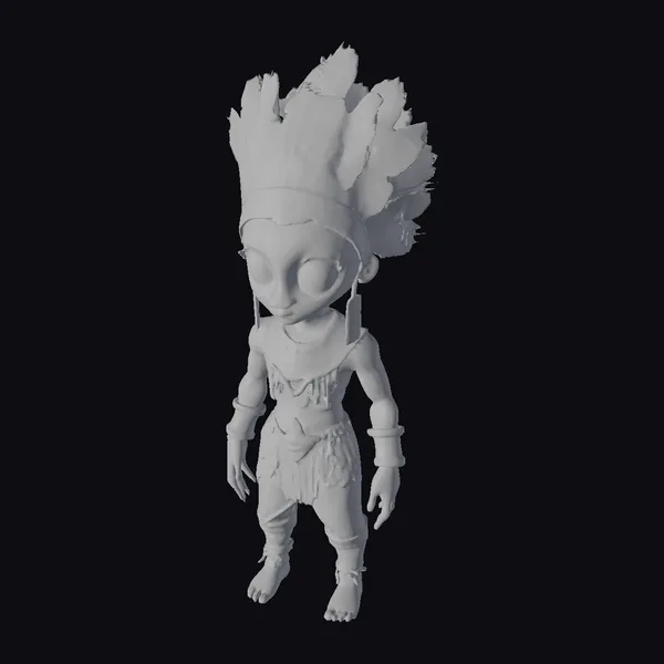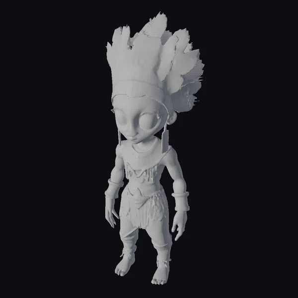 Detailed visual breakdown reveals the model’s playful stance, with the alien’s green skin and large, expressive black eyes drawing immediate attention. The headdress, a kaleidoscope of red, orange, and yellow feathers, contrasts beautifully with the alien’s orange and brown outfit, adorned with detailed jewelry and accessories. This model is perfect for projects requiring a unique blend of science fiction and cultural elements, such as animations, games, or virtual reality experiences. Its stylized appearance ensures it stands out in any scene, offering endless creative possibilities.