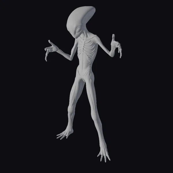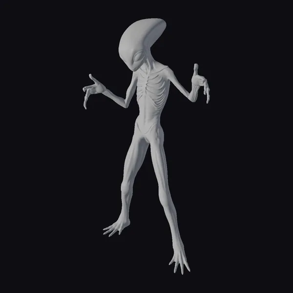 This mesmerizing, abstract creature stands with its arms outstretched, as if in a state of weightlessness or supplication. The model’s semi-transparent skin reveals a complex network of glowing, orange-red veins and muscles, contrasted against a pale, almost ethereal background. The alien’s elongated head, devoid of discernible eyes or nose, seems to be gazing into the distance. Its long, spindly limbs end in delicate-looking hands, complete with multiple fingers. The level of detail in this model, from the texture of its skin to the intricate structure of its skeleton, makes it an ideal choice for projects requiring a truly otherworldly presence, such as sci-fi games, animations, or virtual reality experiences.
