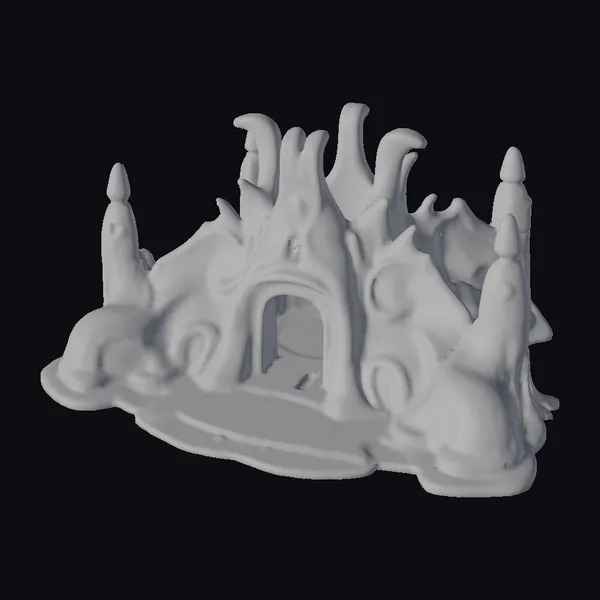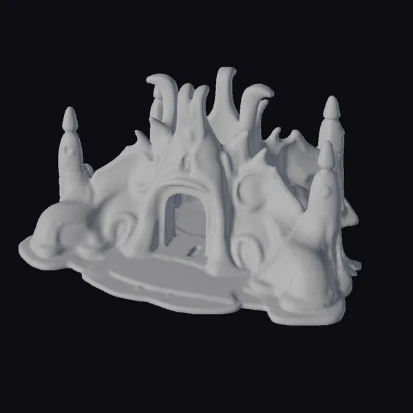 The alien military base is presented in a dynamic pose, showcasing its unique, organic architecture. The model features a central archway that serves as the entrance, flanked by two towers equipped with what appear to be defensive turrets. The surface of the base is adorned with a series of smooth, flowing spires and protrusions, giving it a natural, almost biological appearance. The cream-colored exterior is complemented by metallic accents and glowing blue details, suggesting advanced technology. The base of the structure is flat and slightly irregular, with a textured surface that hints at a functional, utilitarian design. This model is perfect for use in sci-fi games, animations, or architectural designs looking for a futuristic, extraterrestrial feel. Its detailed design and unique aesthetic make it an excellent choice for projects aiming to create an immersive, otherworldly environment.