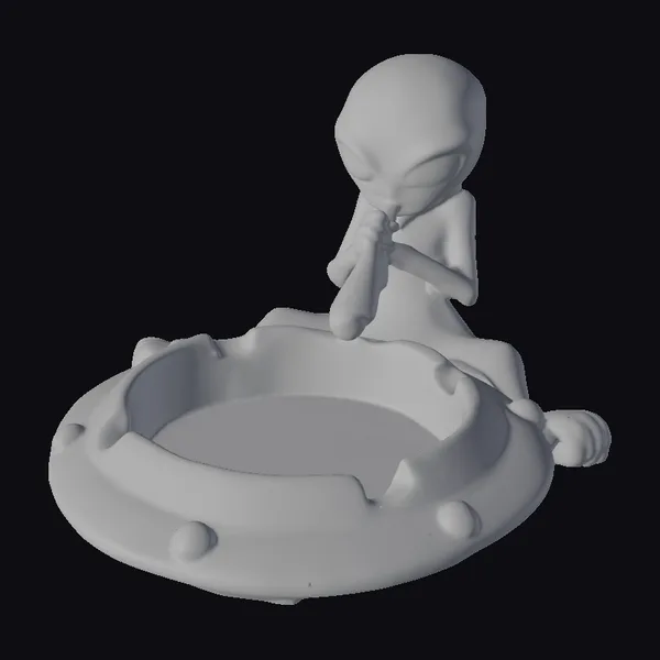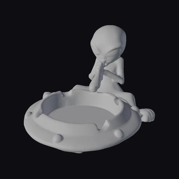 Detailed with precision, this stylized alien sits comfortably on the edge of a UFO-inspired ashtray, one leg bent as it leans forward to take a drag from a cigarette. The alien’s smooth, green skin and oversized, black eyes are meticulously rendered, capturing a moment of leisurely indulgence. The ashtray itself boasts a metallic gray finish, adorned with small, glowing green bolts and a vibrant, rainbow-colored interior that seems to shift from yellow to green to blue. This model is ideal for use in games, 3D printing, VR/AR experiences, animations, or designs looking for a quirky, sci-fi element. Its uniqueness and detailed craftsmanship make it a standout addition to any creative project.