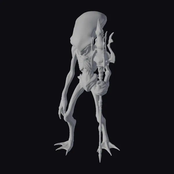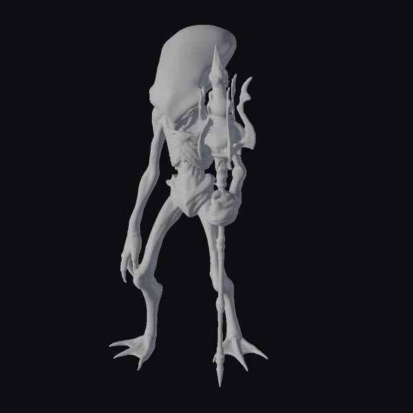 Standing tall with a posture that commands respect, this alien overlord is a masterpiece of sci-fi design. Its body is a marvel of intricate detail, with a metallic exoskeleton that gradates from dark, cool tones to a subtle sheen that catches the light. The creature’s head is a study in contrasts, with a smooth, almost organic crest atop a more angular, skeletal structure. Its eyes are not immediately visible, adding to the enigma of this being. The staff in its hand is a work of art, with golden accents that seem to glow from within, complementing the dark, metallic hues of the overlord’s body. This model is perfect for projects that require a powerful, otherworldly presence, such as games, animations, or virtual reality experiences.