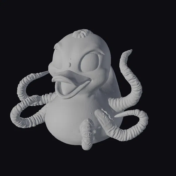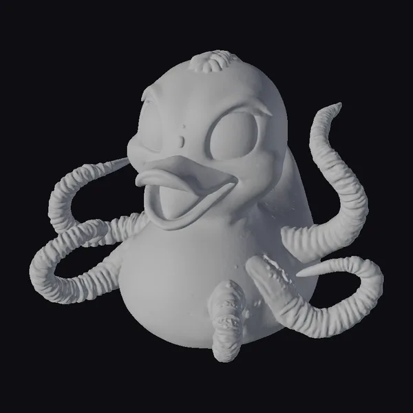 Gaze upon a rubber duck transformed into a fantastical creature, as if an otherworldly alien parasite has taken hold. The duck’s vibrant yellow body and orange beak are juxtaposed with the parasite’s long, coiled tentacles, creating a visually striking contrast. The large, black eyes seem to gleam with mischief, while the open beak adds to the duck’s comically surprised expression. This 3D model boasts intricate details, from the texture of the rubber duck to the ridged surface of the alien appendages. Ideal for use in games, animations, or as a unique decorative piece, this model is sure to captivate audiences with its blend of humor and sci-fi intrigue.