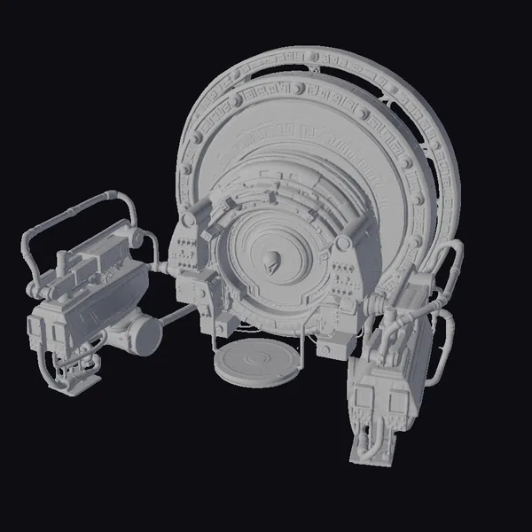 In a dimly lit, industrial setting, a colossal alien portal device stands as a marvel of unknown technology. The device’s teal core pulsates with an ethereal glow, encircled by a complex array of metallic machinery, dark pipes, and hoses. Two smaller, mechanical units flank the portal, their surfaces etched with mysterious symbols and adorned with glowing accents. As the light dances across its surface, the portal’s texture appears both metallic and smooth, inviting and intimidating in equal measure. This 3D model is perfect for adding a touch of sci-fi mystique to games, animations, or virtual reality experiences.