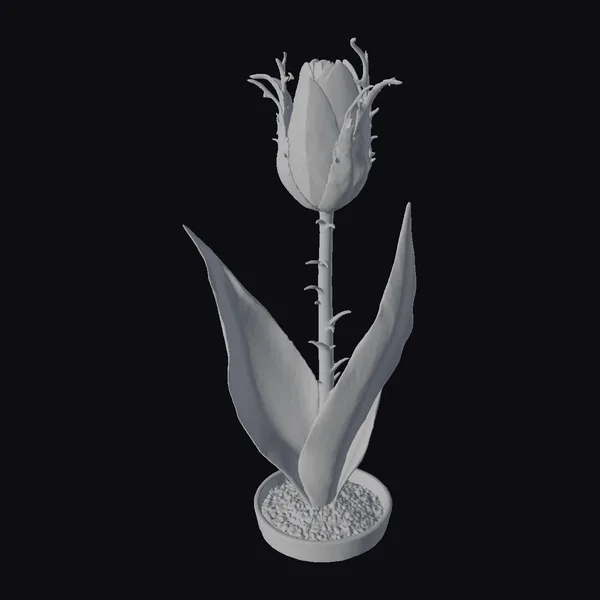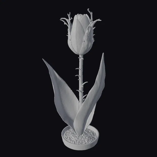 Perched atop a slender, thorn-studded stem, the red tulip’s petals unfold like a dark, alien prayer, their pointed tips reaching towards the light. The leaves, a deep, muted green, fan out from the base, their edges serrated and menacing. The plant’s pot, filled with dark soil, adds to the sense of foreboding. This 3D model would be perfect for adding a touch of science fiction horror to games, animations, or VR/AR experiences. Its unique blend of beauty and danger could also inspire designers working on futuristic or fantasy projects.