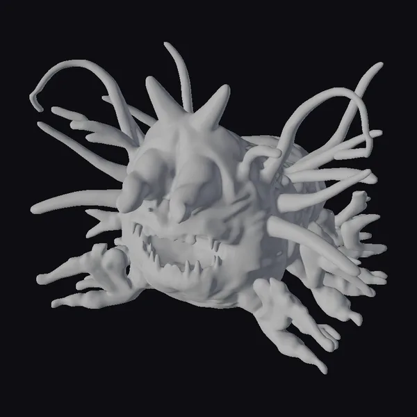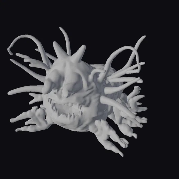 Perched menacingly, this alien sea creature’s grotesque visage commands attention with its bulging, orange-hued eyes and rows of razor-sharp teeth. The model’s surface is adorned with numerous, long, slender tentacle-like protrusions that add to its menacing appearance. The creature’s pale, almost translucent complexion seems to glow with an ethereal light, as if illuminated from within. Ideal for use in horror-themed games, animations, or 3D prints, this model is sure to send shivers down the spine. Its intricate details and textures make it perfect for close-up shots or dramatic scenes. Bring your darkest oceanic nightmares to life with this chilling creature.
