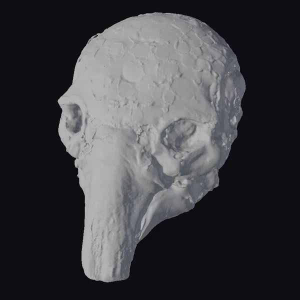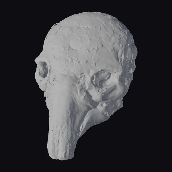 Positioned in a neutral pose, the alien skull artifact presents a chilling visage, its surface adorned with a scaly texture that transitions from light tan at the top to dark grey towards the elongated snout. The empty eye sockets seem to pierce through the darkness, inviting onlookers into a realm of science fiction and horror. The model’s intricate details make it an ideal choice for various applications, including game development, animation projects, virtual reality experiences, and artistic endeavors. Its unique design and high fidelity to a fantastical creature make it a standout asset for creators looking to imbue their work with an essence of the extraterrestrial and the macabre.
