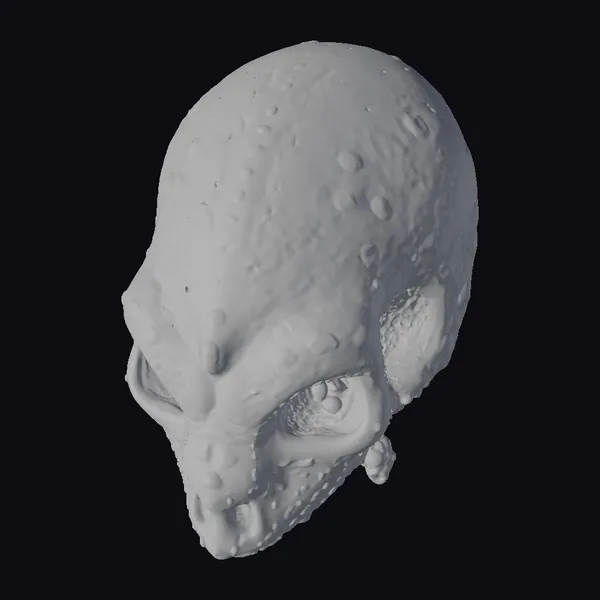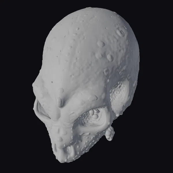 This intricately detailed alien skull model presents a striking appearance, with its smooth gray surface interrupted by a constellation of purple and yellow bioluminescent spots. The eye sockets are notably absent, adding to the skull’s mystique. The model is posed facing slightly downwards, as if peering up from the depths of space. The texture of the skull’s surface is finely rendered, with subtle bumps and ridges suggesting a complex, alien anatomy. The bioluminescent spots vary in size and intensity, casting an ethereal glow across the surrounding surface. Ideal for use in sci-fi animations, games, or 3D printing projects, this model invites users to explore the mysteries of a distant, extraterrestrial world.