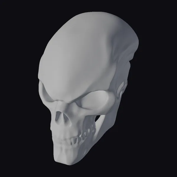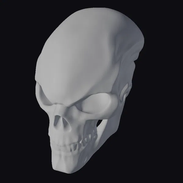 Positioned in a haunting profile view, the alien skull showcases its most striking features: a pronounced cranium with deep sutures, empty eye sockets that seem to stare into the soul, and a mouth set in a grim, toothy grin. The model’s surface texture mimics bone with uncanny accuracy, complete with subtle color variations that suggest a slightly aged, worn appearance. The quality of the render suggests a high level of detail suitable for close-up shots or as a focal point in scenes requiring a sci-fi or horror element. Ideal for use in games, 3D printing, VR/AR experiences, animations, or designs that call for an extraterrestrial or eerie atmosphere.