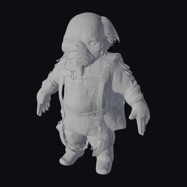 Standing with an air of readiness, this alien explorer boasts a distinctive appearance that blends ruggedness with an undeniable aura of sophistication. Its balding head, marked with age or experience, is complemented by a distinctive tuft of white hair at the back. The eyes, a striking shade of blue, seem to bore into the distance, as if contemplating the vastness of space. The space suit, a blend of functionality and durability, shows signs of use, with frayed edges and a utilitarian design that speaks to the explorer’s profession. The overall pose, with arms slightly extended, suggests a moment of pause, as if the alien is assessing its surroundings before proceeding. This model is perfect for projects requiring a unique, sci-fi character, whether for games, animation, VR/AR experiences, or conceptual design.