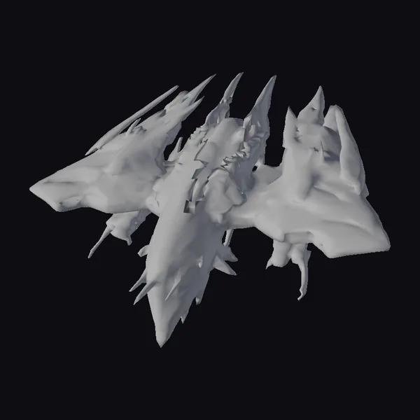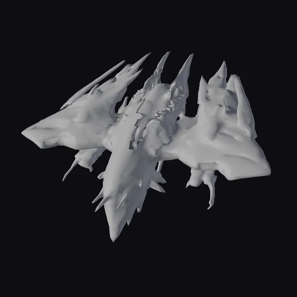 Perched aggressively in mid-air, the Charybdis spaceship commands attention with its unique blend of biomechanical and industrial design elements. The model’s pose showcases its sharp, blade-like body and torn, jagged wing-like extensions, suggesting a vessel built for both speed and combat. The surface is a complex interplay of dark purples and blacks, with glowing red accents that suggest advanced technology or fiery engines. These accents are strategically placed to give the impression of a ship that is both menacing and technologically advanced. The asymmetrical design adds to its predatory appearance, making it seem like a formidable opponent in any intergalactic encounter. This model is perfect for projects that require a spaceship with a strong presence, such as games, animations, or virtual reality experiences.