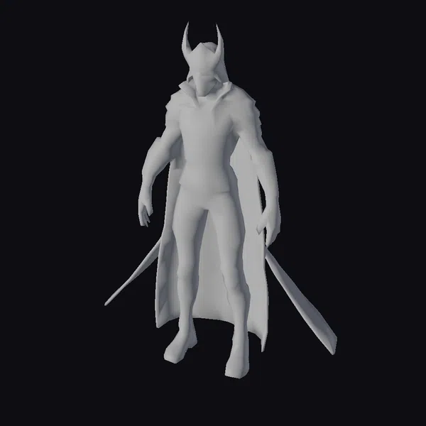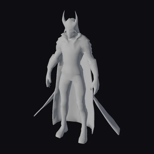 This imposing figure showcases a detailed blend of sci-fi and fantasy elements. The alien warrior’s pose, with feet shoulder-width apart and hands slightly away from the body, exudes confidence and readiness. The silver armor, detailed with green accents at the joints, covers the alien’s body, while a dark cape flows behind, suggesting movement even in stillness. The helmet, with its sharp, pointed horns, adds to the warrior’s intimidating presence. The red eyes gleam with an inner light, suggesting a fierce inner power. The long sword, held casually in one hand, speaks to the warrior’s readiness for combat. This model is perfect for projects requiring a futuristic, otherworldly character, such as games, animations, or virtual reality experiences.