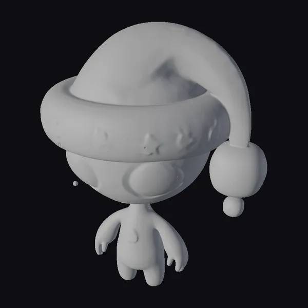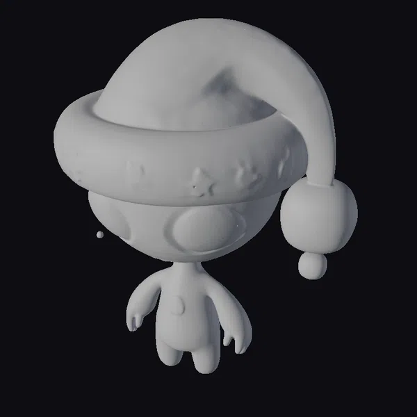 Floating dynamically against a plain backdrop, the alien’s pose showcases its Santa hat, which features a curved brim and a fluffy pom-pom. The hat’s white band is decorated with intricate snowflake patterns, adding a touch of festive cheer. The alien itself has a smooth, metallic surface with a subtle sheen, complemented by large, expressive eyes that seem to sparkle with curiosity. Its small, rounded body and limbs are proportionally detailed, making it an engaging model for various applications, including games, animation, and design projects. The stylized approach gives the model a unique, artistic feel that’s perfect for creative endeavors.