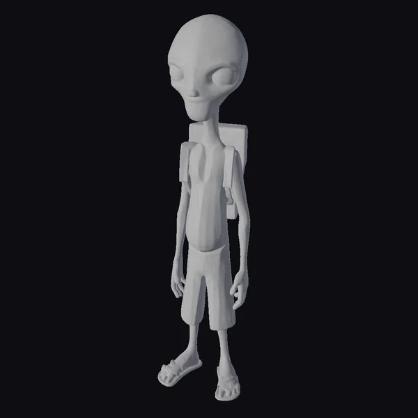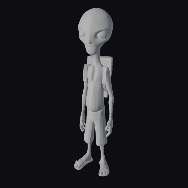This stylized alien character is posed with a subtle smile, showcasing its pale skin and striking blue eyes. The alien’s slender physique is accentuated by its casual attire, consisting of brown shorts and sandals, with a backpack strapped to its back. The model’s unique features, such as its elongated head and limbs, are highlighted by the soft lighting. Ideal for use in sci-fi projects, animations, or games, this model brings a touch of otherworldly charm to any scene.