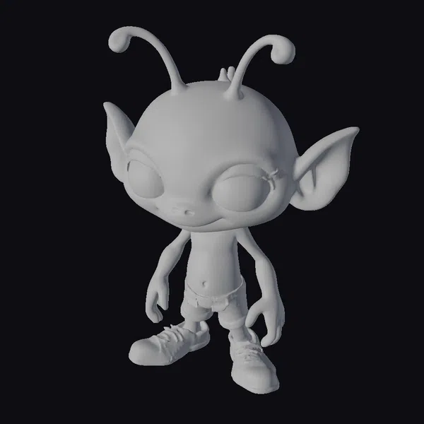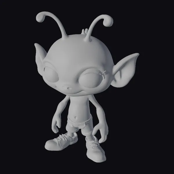 Standing with a slight lean, this charming alien creature presents itself with an irresistible charm. Its large, round head is adorned with two slender antennae that curl at the tips, adding to its otherworldly yet friendly appearance. The creature’s eyes are its most striking feature – huge, round, and a deep shade of red that seems almost glowing. The blue skin has a smooth texture, and its ears are slightly pointed, contributing to its extraterrestrial look. Dressed in a pair of shorts and sneakers, the alien exudes a casual, laid-back vibe. The model is meticulously detailed, with subtle shading and texture that bring out the stylized yet realistic appearance of the creature. Its pose suggests a readiness to engage, making it perfect for projects that require a friendly, approachable alien character. Whether for animation, game development, or virtual reality experiences, this model is sure to capture the imagination of audiences.