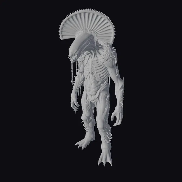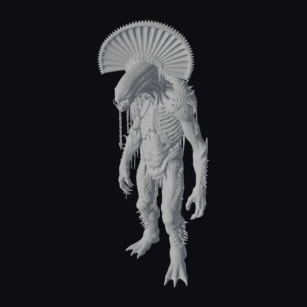 Standing tall with a posture that commands attention, this alien creature showcases a blend of grotesque and fascinating features. Its elongated head, a pinkish hue, contrasts with the green and dark tones of its body, covered in spines and ridges. The crown on its head, resembling a fan of spines, adds a dramatic effect to its already imposing presence. The creature’s skeletal structure is visible under its skin, adding to its alien and somewhat skeletal appearance. This model is perfect for projects requiring a sci-fi or fantasy element, especially in scenes that demand a creature of mystery and terror. It can be used in games, 3D print projects, VR/AR experiences, animations, or any design work aiming for a futuristic or extraterrestrial theme.