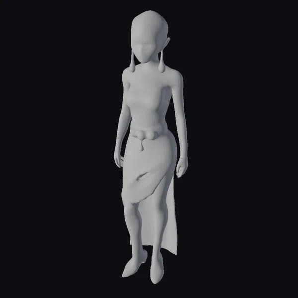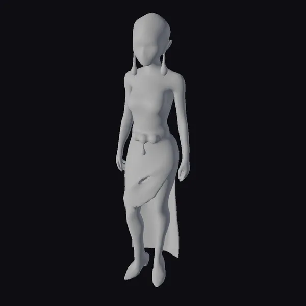 Standing poised with her weight shifted onto one leg, this alien woman exudes an aura of serene confidence. Her smooth, pale skin and bald head are beautifully contrasted with the rich, golden ornaments that adorn her neck, shoulders, wrists, and feet. The white dress, flowing and draped elegantly around her body, features a high neckline and a skirt that flows behind her like a river of moonlight. The gold accessories – a belt, cuffs, and a necklace – catch the light, suggesting a subtle sheen that could be metal or perhaps something more exotic. Her dark eyes seem to hold a thousand secrets, adding depth to her enigmatic presence. This model would be perfect for projects that require a blend of sci-fi and fantasy elements, such as animations, games, or virtual reality experiences.