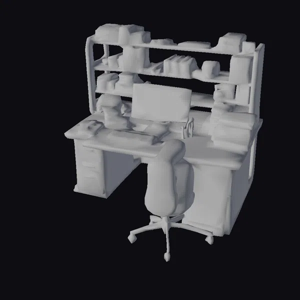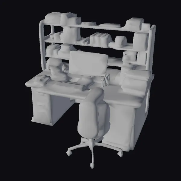 Perched on wheels, a teal office chair invites you to sit and work amidst a futuristic landscape. The desk, a blend of gray and purple hues, boasts an array of gadgets and gizmos, including a computer monitor, keyboard, and an assortment of colorful office supplies. Above, a shelving unit holds binders, books, and boxes in a rainbow of colors. This workspace station is perfect for 3D modeling, animation, and game design projects, offering a richly detailed environment to spark creativity. Whether for printing, VR/AR, or simply as a design reference, this model is meticulously crafted to transport you to a world beyond the ordinary.