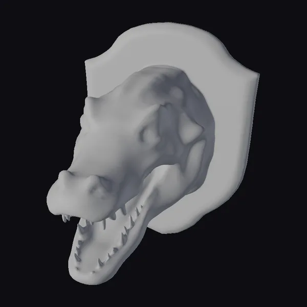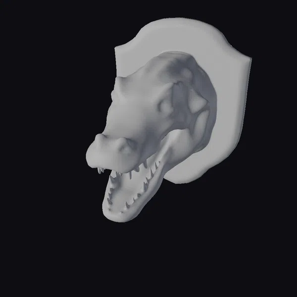 Positioned in a menacing pose, this alligator head wall mount showcases an open mouth revealing rows of razor-sharp teeth, set against a sturdy gray shield-like backing. The model’s texture captures the rugged, scaly skin of the alligator, with a color palette that shifts from dark to light gray, accented by yellow eyes. The level of detail extends to the subtle shading around the eyes and mouth, creating a sense of depth. Ideal for games, 3D printing, VR/AR experiences, animation, and design projects, this model brings a touch of the wild into digital and physical spaces.