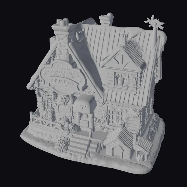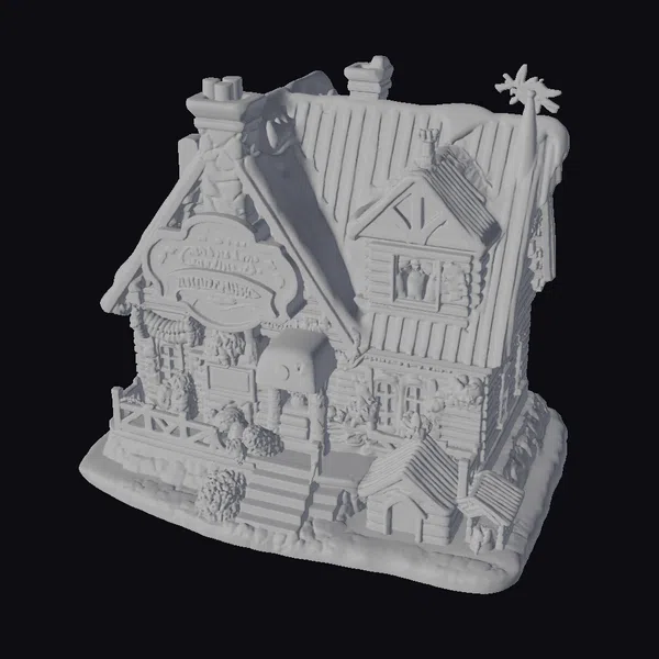 Perched on a base that mimics the natural earthy tones of a forest floor, the Alpine Pet Lodge model is a marvel of detailed design. The building itself boasts a sturdy log cabin structure, complete with a snow-laden roof, a stone chimney puffing out smoke, and a festive array of pumpkins and greenery. The main lodge features a cozy porch area, complete with a doggy door and a cheerful sign. A smaller, attached structure appears to serve as a separate pet house or storage area. The model’s intricate details, from the paw print on the doggy door to the snowflakes on the roof, make it a perfect addition to any festive or thematic scene. Whether you’re creating a winter wonderland, a holiday display, or simply looking for a unique architectural model, the Alpine Pet Lodge is sure to captivate. Its applications are vast, ranging from game environments and animations to 3D printing and architectural visualizations.
