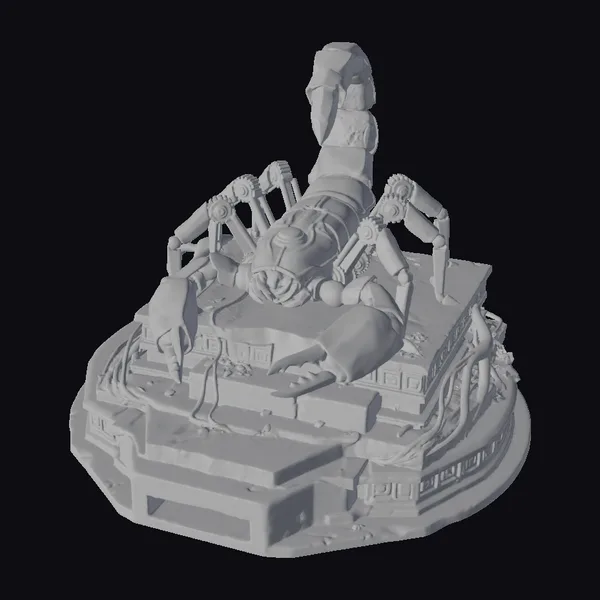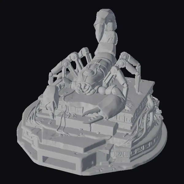 In a dynamic pose that suggests movement and power, the scorpion’s body is intricately detailed with textures that mimic both metal and the natural exoskeleton of a scorpion. The base, adorned with ancient patterns, adds a layer of historical depth, suggesting a bridge between past and future. The amber crown, glowing with an inner light, draws the eye upwards, symbolizing a fusion of organic and synthetic life. This model is perfect for projects requiring a blend of sci-fi and fantasy elements, such as animations, games, or architectural designs that seek to push the boundaries of imagination.